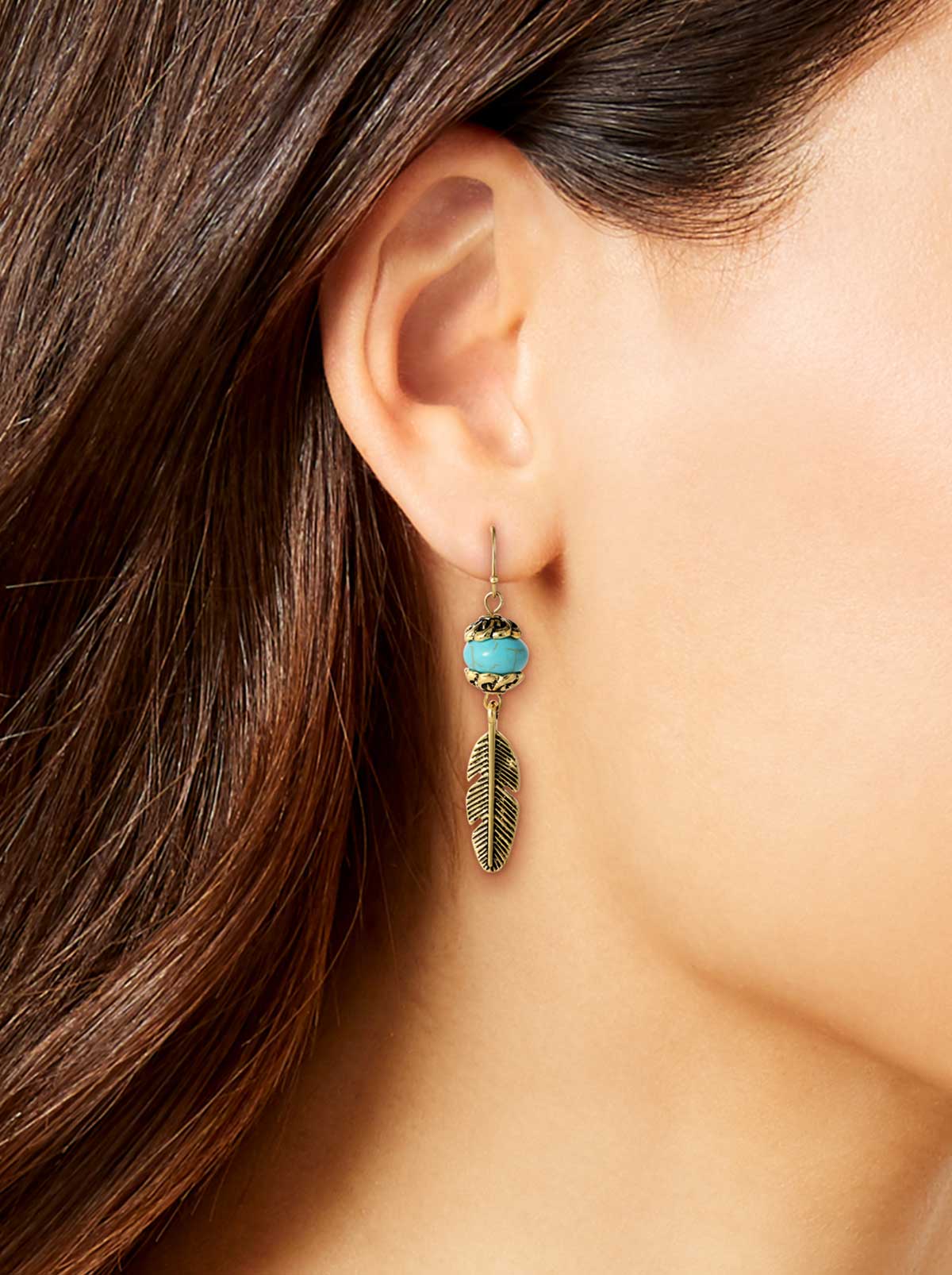 Add a touch of color to your look with our Turquoise Bead Feather Drop Earrings in gold-tone metal